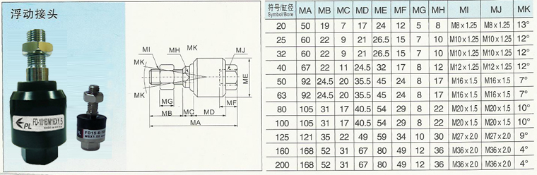 如把氣缸直徑安裝到被移動(dòng)物體上,可能會(huì)因“偏心”,“平衡度精度不良”等原因,發(fā)生“活塞桿彎曲”,“桿支軸承和桿密封件磨損”等,降低氣缸的性能,縮短氣缸的使用壽命。浮動(dòng)聯(lián)軸器正是未來解決偏心的問題,是氣缸動(dòng)作平穩(wěn),浮動(dòng)聯(lián)軸器已加潤(rùn)滑油,不需要另外加油!浮動(dòng)接頭吸收連接件和氣缸的偏心和平行精度不足,使氣缸和連接件在允許的偏心范圍內(nèi)也可工作,它用于浮動(dòng)接頭組件,使得氣缸安裝時(shí)不必對(duì)中和最后的微調(diào)整。消除兩軸間因連結(jié)誤差,所產(chǎn)生的干涉現(xiàn)象、可適度放大配合件之加工精度。符合體積小,高抗位,抗壓強(qiáng)度要求!